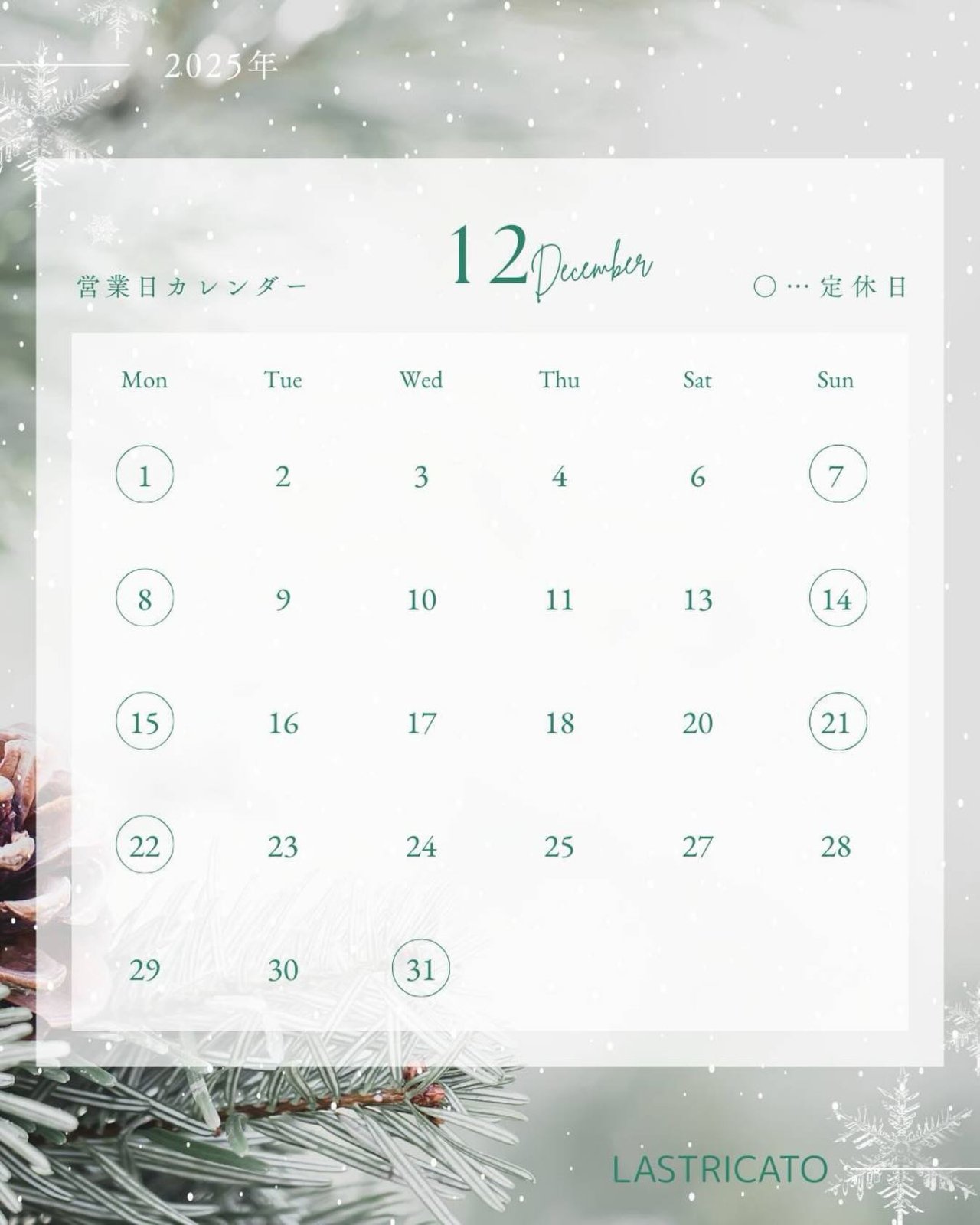 12月の定休日をお知らせ致します。