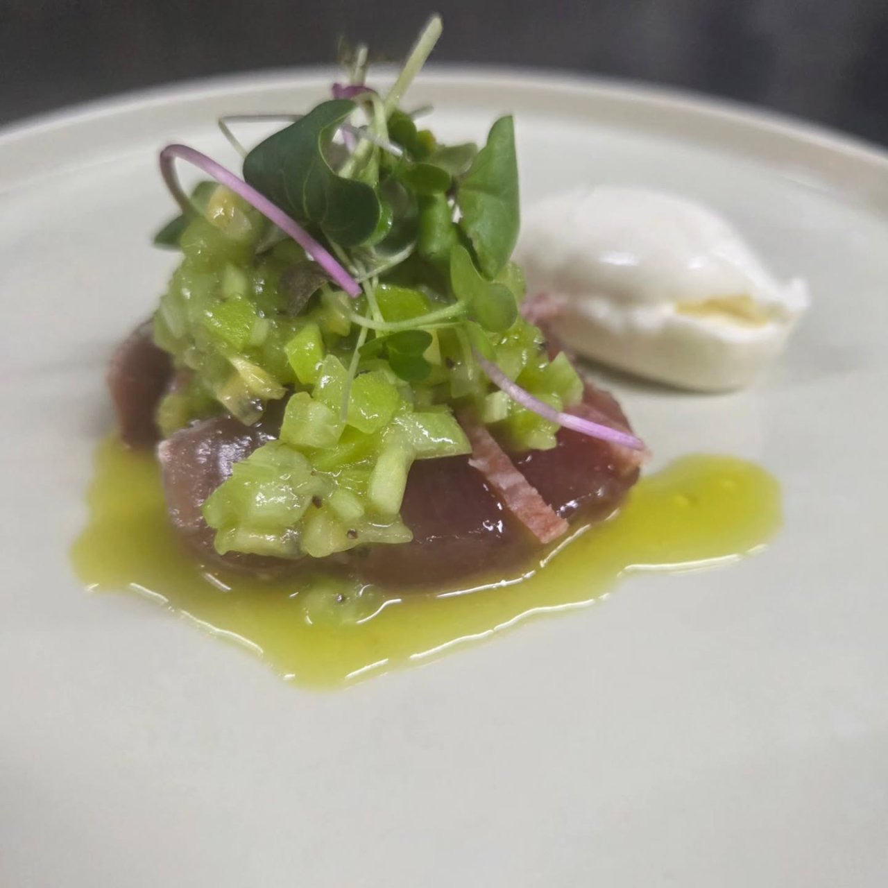 初鰹😍鰹フロマージュブランムースキウイフルーツアボカドキュウリ新緑のソースが爽やかです😁#神楽坂イタリアン#神楽坂ラス...