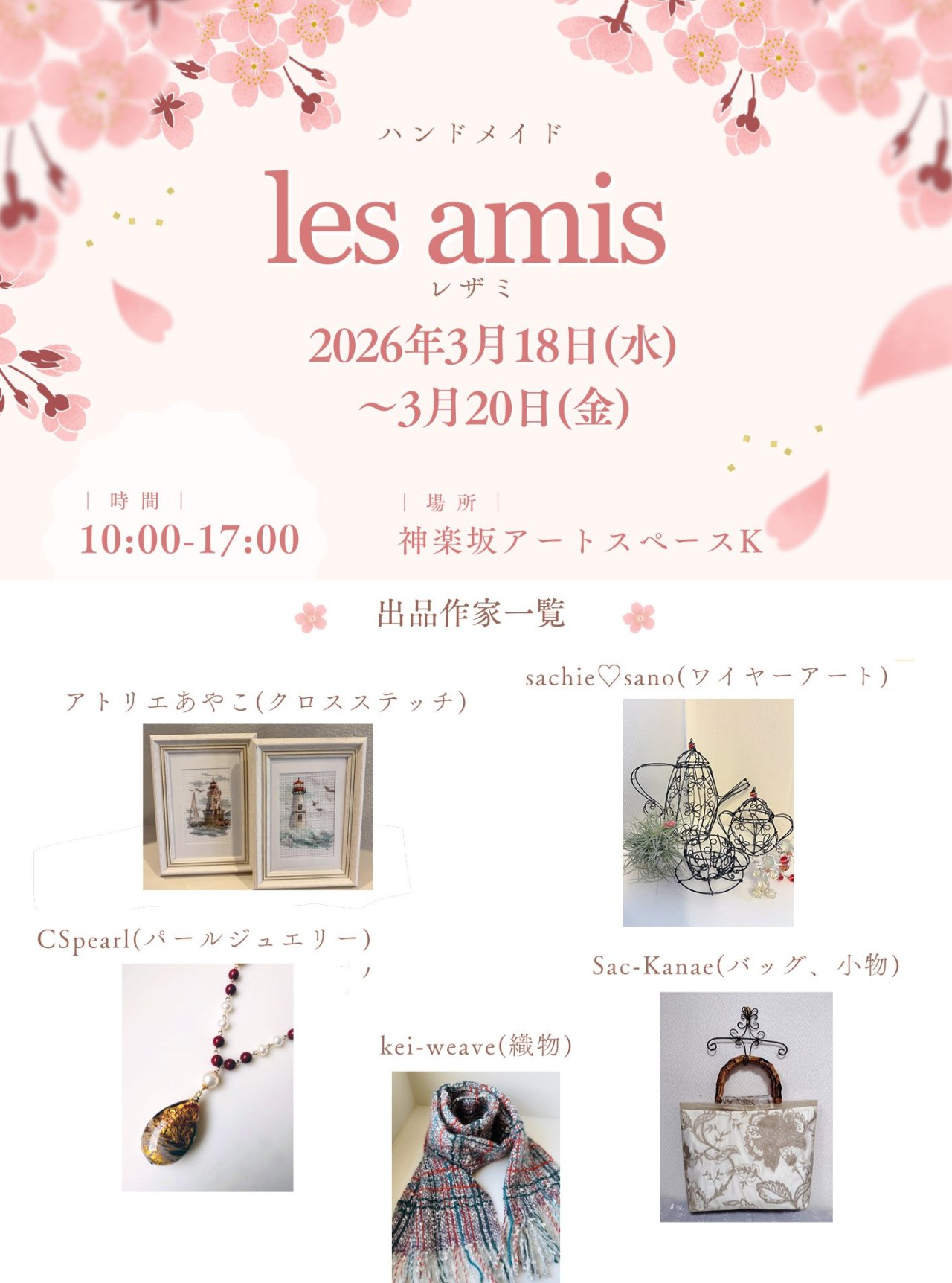 ハンドメイドles amis レザミ5人の仲間でles Ami’s レザミ作品展を神楽坂にて3日間行います。駅から歩いてすぐのアクセスの良い場...
