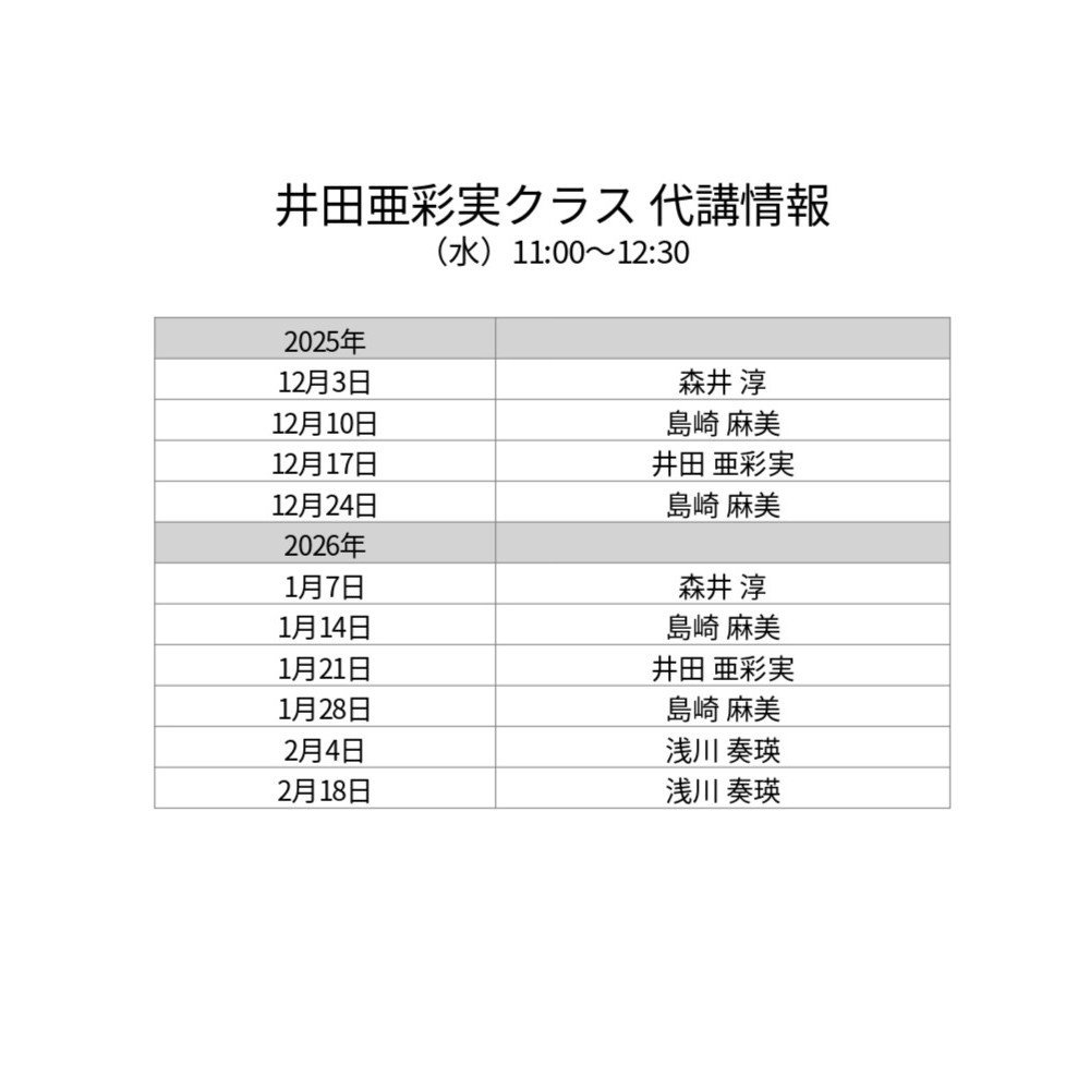 井田亜彩実クラス 代講スケジュールのお知らせ(水)11:00~12:3012月以降の代講スケジュールが決定しました✨ご予約も本日よりス...