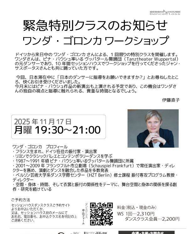 【お知らせ】ワンダ・ゴロンカ 緊急特別クラス開催!11月17日(月) 19:30〜21:00ドイツから来日中のワンダ・ゴロンカさんが、1回限...