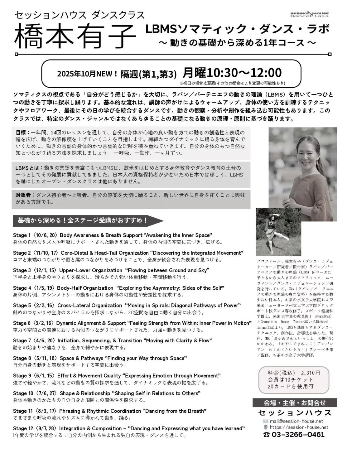 ✨橋本有子 ダンスクラス LBMSソマティック・ダンス・ラボ ~動きの基礎から深める1年コース~Stage 2〈11/10・17〉月曜10:30~12...