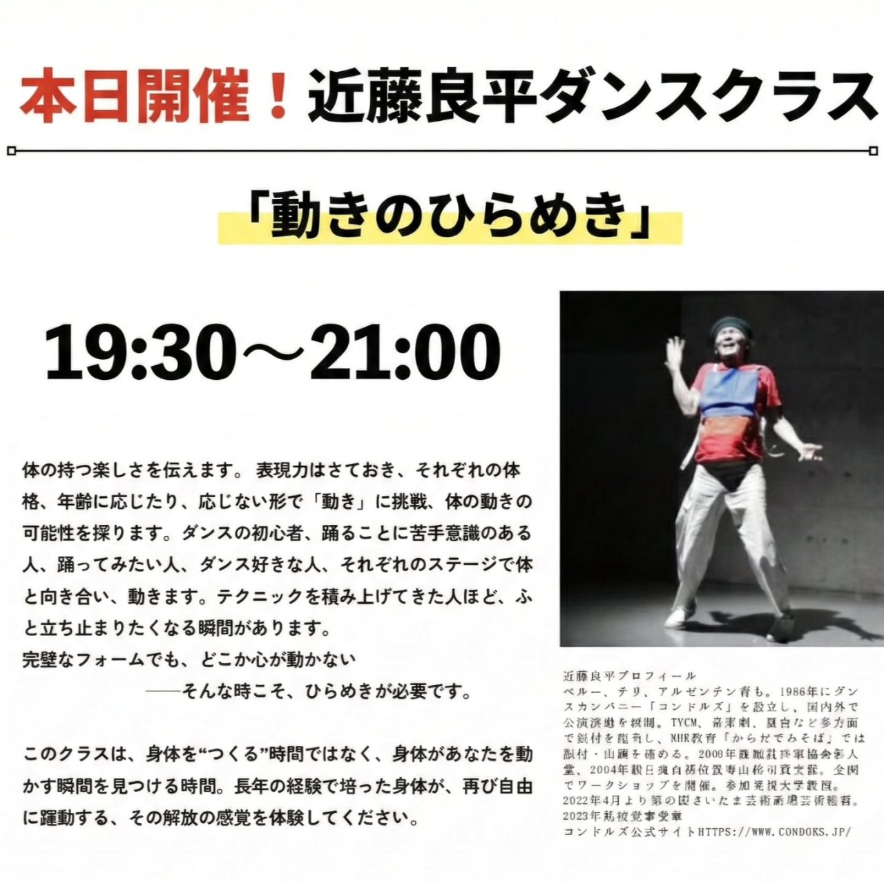 【本日開催!近藤良平クラス】「動きのひらめき」を体験しよう!本日19:30〜21:00、セッションハウスにて、コンドルズ主宰・近藤良...