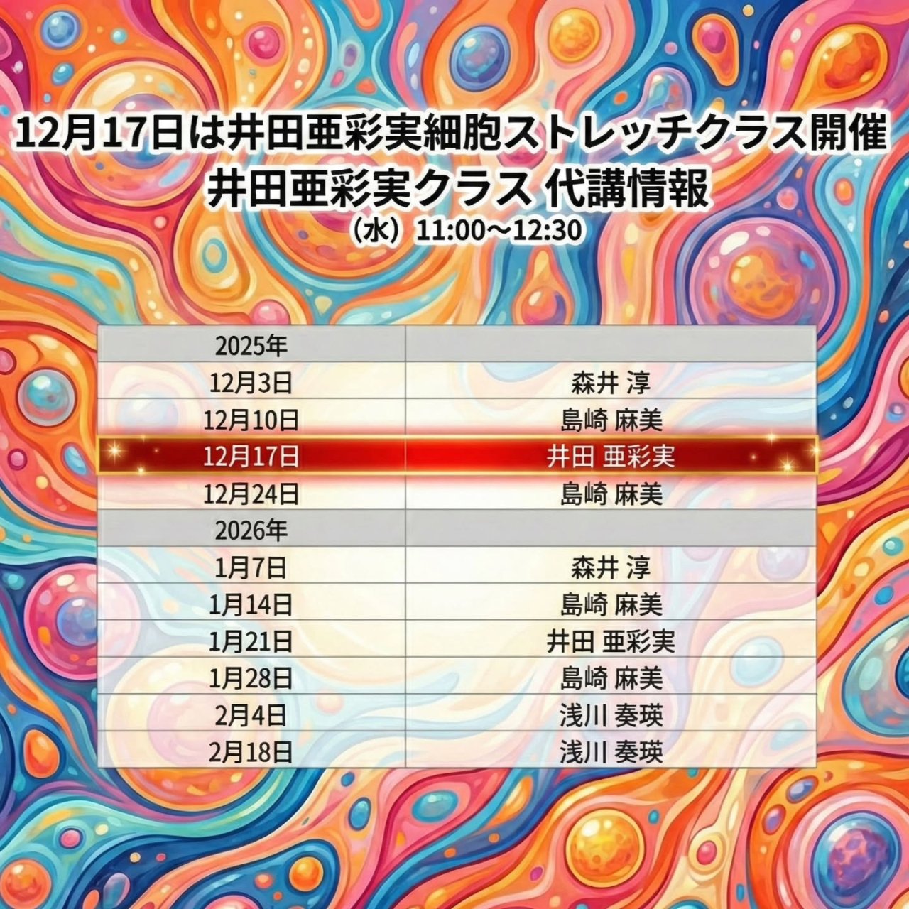 【明日開催!】井田亜彩実クラス 12/17(水) 11:00〜12:30は 「井田亜彩実 細胞ストレッチクラス」を開催します!身体の隅々まで意...
