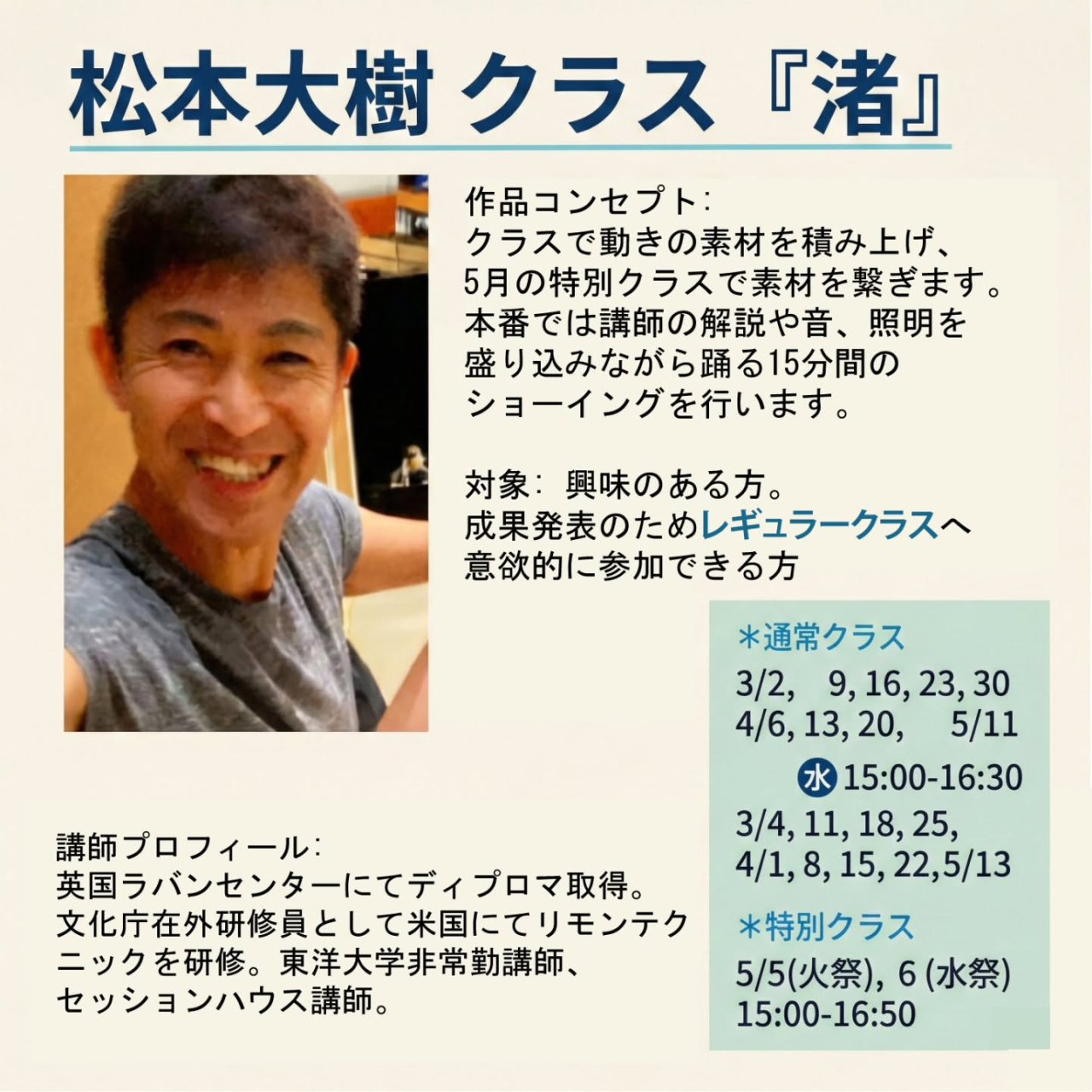 ダンス専科2026松本大樹 クラス『渚』参加者募集 クラスで動きの素材を積み上げ、5月の特別クラスでひとつの流れへ。 本番は、講...