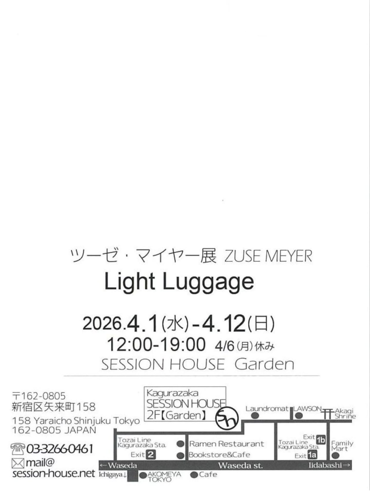 毎年春に恒例の展覧会のハガキが届きました。今年も神楽坂セッションハウスにて、 ツーゼ・マイヤー展「Light Luggage」 を開催いた...