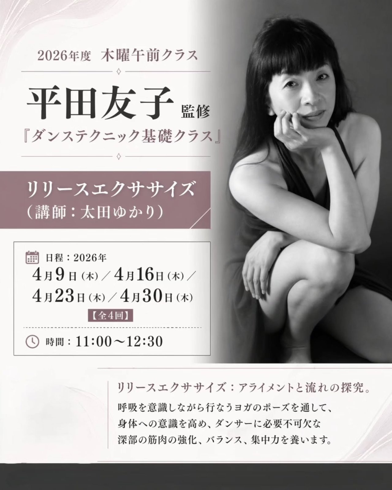 明日開催!木曜午前クラスリリースエクササイズ(講師:太田ゆかり)4/23(木)11:00~12:30呼吸を意識したヨガのポーズなどを通...