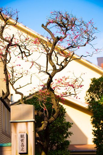 このところの陽気で矢来能楽堂の門そばにある紅梅の花が開きはじめました。