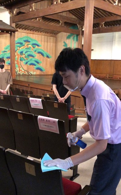 矢来能楽堂スタッフが、ダスキンサービスマスターさんより、客席座席の消毒についてレクチャーを受けました。