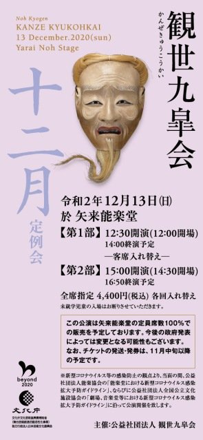 12月13日(日)【観世九皐会12月定例会】矢来能楽堂第1部(12:30) 能「小鍛冶」観世喜之(観世九皐会当主です!)第2部(15:00)...