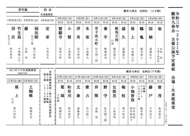 令和3年の観世九皐会主催公演(於:矢来能楽堂)予定番組が決まりました。観世九皐会定例会、上半期セット券のご予約は11月16日よ...