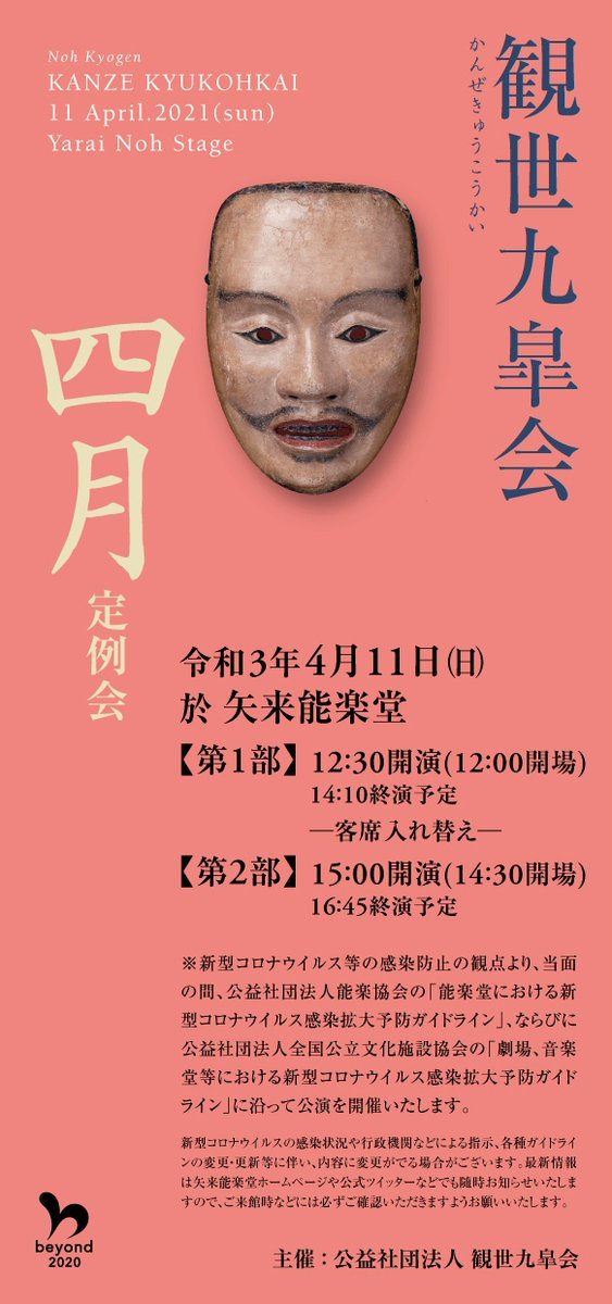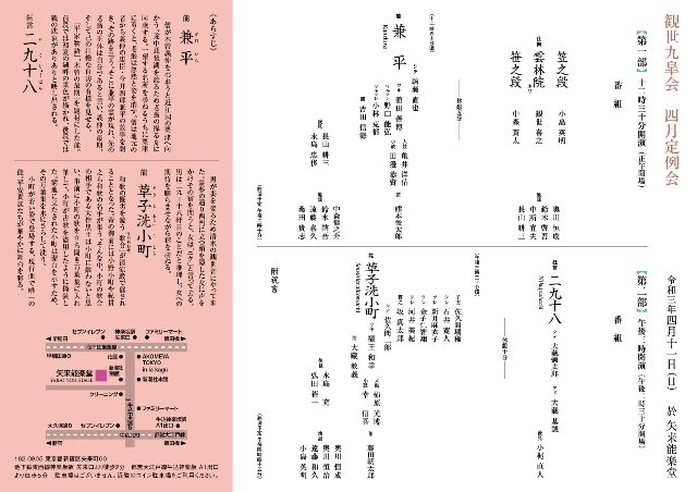 4月11日(日)【観世九皐会4月定例会】於:矢来能楽堂(神楽坂)第1部 能「兼平」駒瀬直也 ほか仕舞第2部 狂言「二九十八」大...