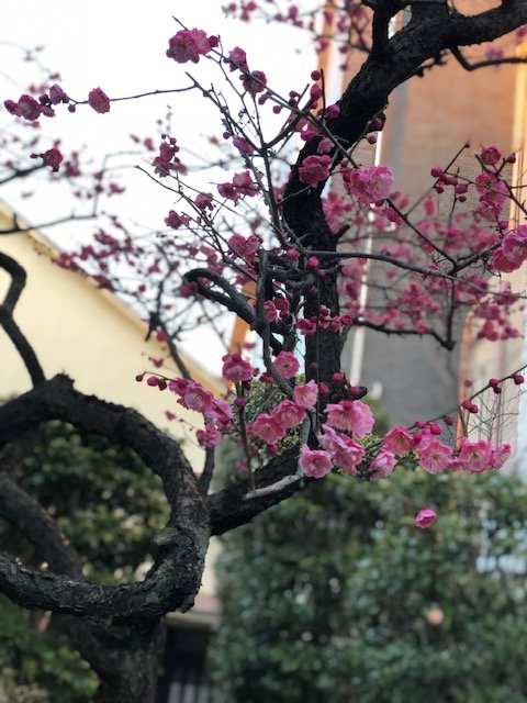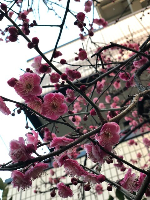 矢来能楽堂の門内に入ってすぐの紅梅が満開です。