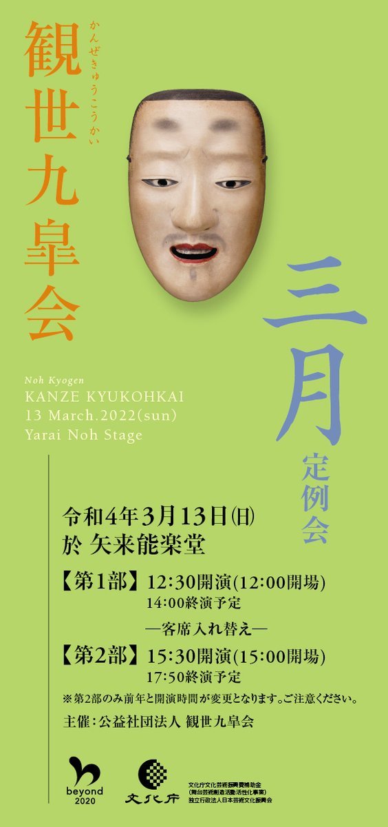 【観世九皐会3月定例会】令和4年3月13日(日)【第1部】12:30開演狂言「しびり」シテ山本泰太郎能「忠度」シテ遠藤和久 【第2...
