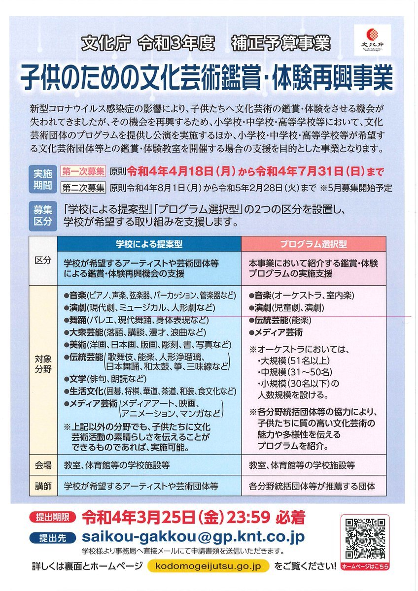 文化庁「子供のための文化芸術鑑賞・体験再興事業」 第二次実施希望校募集のお知らせ締切日:令和4年6月30日(木) 必着小学校、...